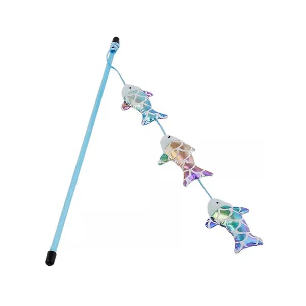 Varita con tres peces en peluche para gatos y hierba gatera.